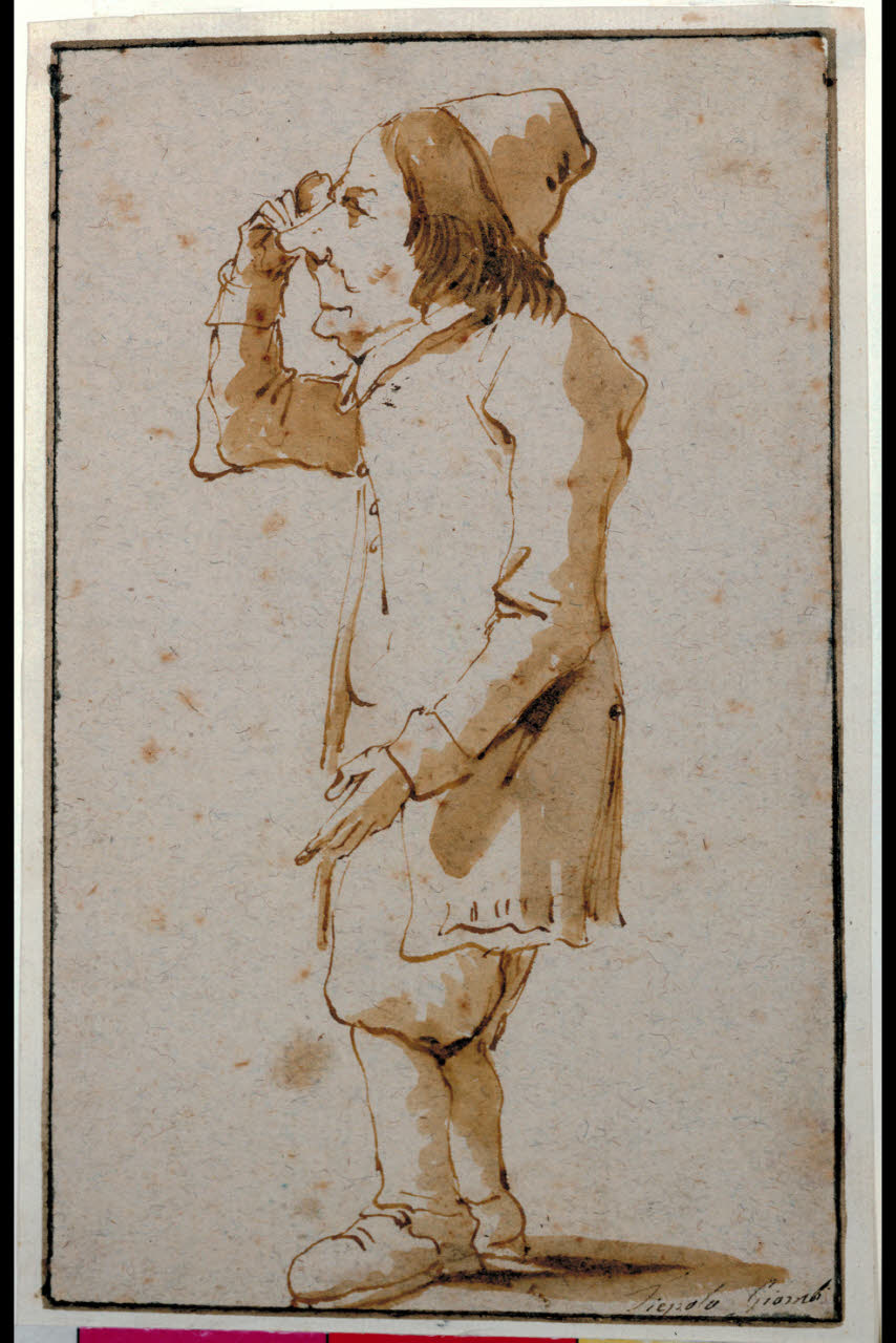 - NOTIZIE STORICO CRITICHE Il foglio proviene dalla raccolta di Gustavo Frizzoni e fa parte di un prezioso gruppo di caricature eseguite da Giambattista Tiepolo conservate presso il Gabinetto dei Disegni del Castello Sforzesco. Il ductus della penna assai sciolto e le ombre stese a pennello contribuiscono a conferire alla figura un fresco e momentaneo carattere umoristico. Nella produzione grafica di Giambattista Tiepolo si conoscono oltre duecento altri disegni analoghi di caricature, conservati in diversi musei e collezioni private. L'omogeneità del formato dei fogli del Castello Sforzesco, molti dei quali con gli angoli tagliati, oltre a similitudini tecniche, hanno fatto ipotizzare per essi una datazione ravvicinata fra il 1755 e il 1760. Morassi (1959) riteneva che essi andassero collocati cronologicamente al tempo della decorazione della villa Valmarana a Vicenza nel 1757, rilevando come la vena umoristica fosse ben presto apparsa nella produzione di Giambattista e come il figlio Domenico, ereditandola, l'avrebbe potenziata. In Tiepolo le caricature hanno soluzioni di volta in volta libere e non trovano riscontri puntuali nei personaggi illustri del suo tempo, ma sono piuttosto volte a esasperare, caricandoli, atteggiamenti e aspetti esteriori dei diversi ceti della società veneziana: alcune attitudini (figure di spalle, in piedi di profilo, sedute, ecc...) si possono individuare in una serie così ricca, senza mai una ripetizione, a testimonianza di una vena inventiva inesauribile.