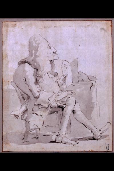 - NOTIZIE STORICO CRITICHE Il foglio proviene dalla raccolta di Giovanni Morelli e fa parte di un prezioso gruppo di caricature eseguite da Giambattista Tiepolo conservate presso il Gabinetto dei Disegni del Castello Sforzesco. Il ductus della penna assai sciolto e le ombre stese a pennello contribuiscono a conferire alla figura un fresco e momentaneo carattere umoristico. Nella produzione grafica di Giambattista Tiepolo si conoscono oltre duecento altri disegni analoghi di caricature, conservati in diversi musei e collezioni private. L'omogeneità del formato dei fogli del Castello Sforzesco, molti dei quali con gli angoli tagliati, oltre a similitudini tecniche, hanno fatto ipotizzare per essi una datazione ravvicinata fra il 1755 e il 1760. Morassi (1959) riteneva che essi andassero collocati cronologicamente al tempo della decorazione della villa Valmarana a Vicenza nel 1757, rilevando come la vena umoristica fosse ben presto apparsa nella produzione di Giambattista e come il figlio Domenico, ereditandola, l'avrebbe potenziata. In Tiepolo le caricature hanno soluzioni di volta in volta libere e non trovano riscontri puntuali nei personaggi illustri del suo tempo, ma sono piuttosto volte a esasperare, caricandoli, atteggiamenti e aspetti esteriori dei diversi ceti della società veneziana: alcune attitudini (figure di spalle, in piedi di profilo, sedute, ecc...) si possono individuare in una serie così ricca, senza mai una ripetizione, a testimonianza di una vena inventiva inesauribile.