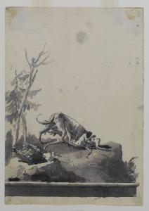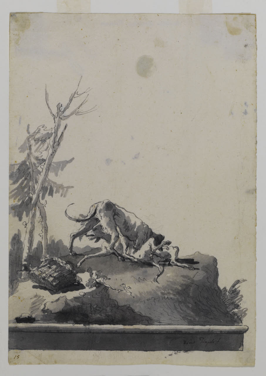 - NOTIZIE STORICO CRITICHE Il disegno, entrato nelle civiche collezioni milanesi nel 1863 mediante legato testamentario di Antonio Guasconi, illustra due cani che si azzuffano sopra un basamento e reca in basso la firma di Giandomenico Tiepolo, figlio maggiore e collaboratore di Giambattista Tiepolo. Da riferire all'ultimo decennio del secolo secondo Arslan (1965), il disegno fa parte del gruppo dei Piccoli animali, che comprende quarantacinque esemplari, la maggior parte dei quali in rapporto più o meno diretto con le acqueforti di Stefano della Bella (Byam Shaw 1959) alle quali Giandomenico Tiepolo si ispirò per queste estrose divagazioni grafiche. Già Byam Sham (1959; 1962) aveva ricondotto i disegni con animali ad un fregio, forse per sovrapporte, destinate alla Villa di Zianigo i cui affreschi impegnarono l'artista tra il 1770 e il 1797 circa. I due cani del Castello Sforzesco si ritrovano nella medesima posa inseriti in basso a sinistra in un disegno di Giandomenico Tiepolo con un "Viandante che si riposa guardando dei cani giocare", in collezione privata (cfr. Gealt, Knox 2005, p. 95 n. 11) e in un affresco con "Lotta tra centauri" proveniente dal Camerino dei Centauri di Villa Zianigo, oggi a Ca' Rezzonico.