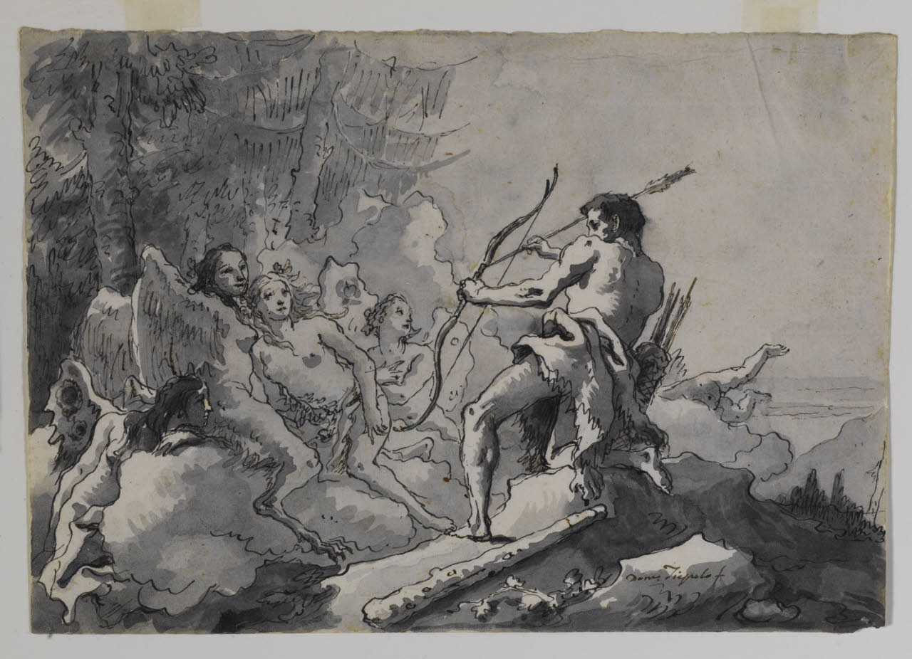 - NOTIZIE STORICO CRITICHE Proveniente dalla collezione del milanese Antonio Guasconi, il foglio in esame reca in basso a destra su una pietra la firma di Giandomenico Tiepolo, il maggiore dei figli di Giambattista Tiepolo ed era registrato negli antichi inventari museali come Ercole che attacca le satiresse. Il soggetto sembra piuttosto illustrare una delle dodici fatiche di Ercole, per la precisione la sesta, nella quale si narra l'uccisione degli uccelli del lago Stinfalo. Secondo il mito, queste creature erano donne, figlie di Stinfalo e Ornite e infestavano con la loro minacciosa presenza la palude Stinfalia, dove erano solite vivere, nutrendosi di carne umana che si procacciavano per mezzo di penne, becco e artigli in bronzo. Tiepolo qui rappresenta il semidio, vestito con la pelle del leone Nemeo, frutto della sua prima fatica, con accanto il più classico dei suoi attributi, la clava. Con arco e frecce si accinge a colpire i terribili mostri mitologici dal volto di donna e corpo d'uccello, qui però insolitamente mansuete e immortalate in pose sensuali. Il tema mitologico sembra reinterpretato dall'artista per aderire a quelle istanze di intrattenimento galante destinate ad un pubblico aristocratico che erano molto in voga nel Settecento. Il foglio del Castello Sforzesco fa parte di una serie costituita da un centinaio di disegni realizzati da Giandomenico Tiepolo aventi per soggetto satiri, centauri e ninfe ed è da mettere in stretto rapporto con la medesima scena affrescata in un tondo per la Villa Valmarana a Vicenza, passata recentemente sul mercato antiquario.