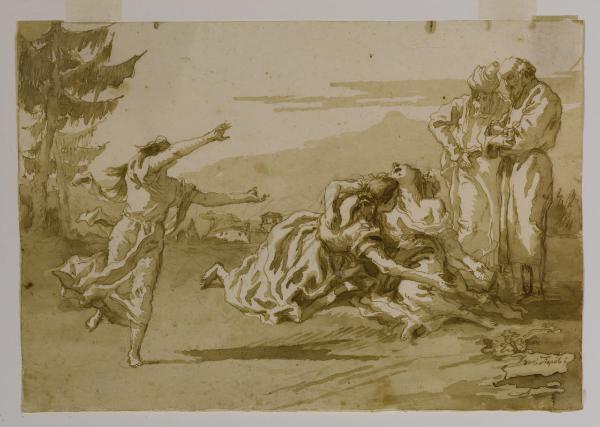 - NOTIZIE STORICO CRITICHE Proveniente dalla collezione di Antonio Guasconi, questo foglio firmato da Giandomenico Tiepolo entrò nelle collezioni civiche nel 1863 mediante legato testamentario. Il foglio presenta una scena di incerta individuazione: una donna riversa a destra con due vecchi in piedi, di cui uno vestito con tunica e turbante, che l'osservano e un'altra donna che accorre da sinistra. La scena presenta ampi intervalli vuoti, caratterizzati da una certa rispondenza tra il cielo sostanzialmente sgombro di nubi e la fascia di terreno in basso, e sembra configurarsi come un fregio (Arslan 1965); le figure sono dominate da un verticalismo enfatizzato dai drappeggi mossi dalla luce. Cronologicamente, il disegno sembra collegarsi alla fase matura dell'artista, in prossimità della serie biblica che Byam Shaw fissa intorno al 1790: Giandomenico abbandona qui gli accenti barocchi della sua produzione più giovanile per aderire ad un linguaggio più composto, quasi neoclassico.