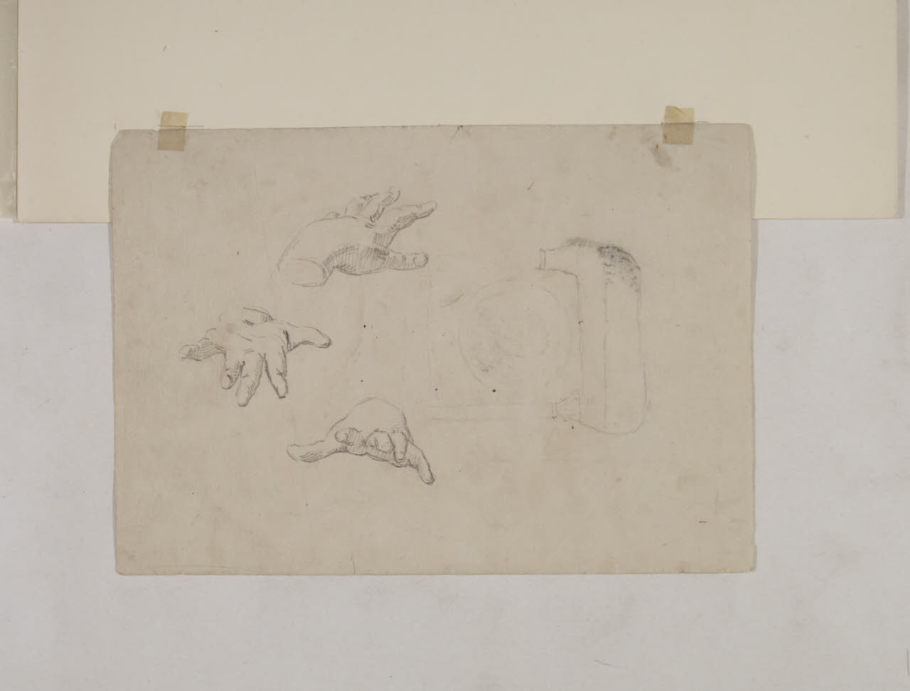 Tre studi di mani e dettaglio architettonico di nicchia con ritratto in un tondo