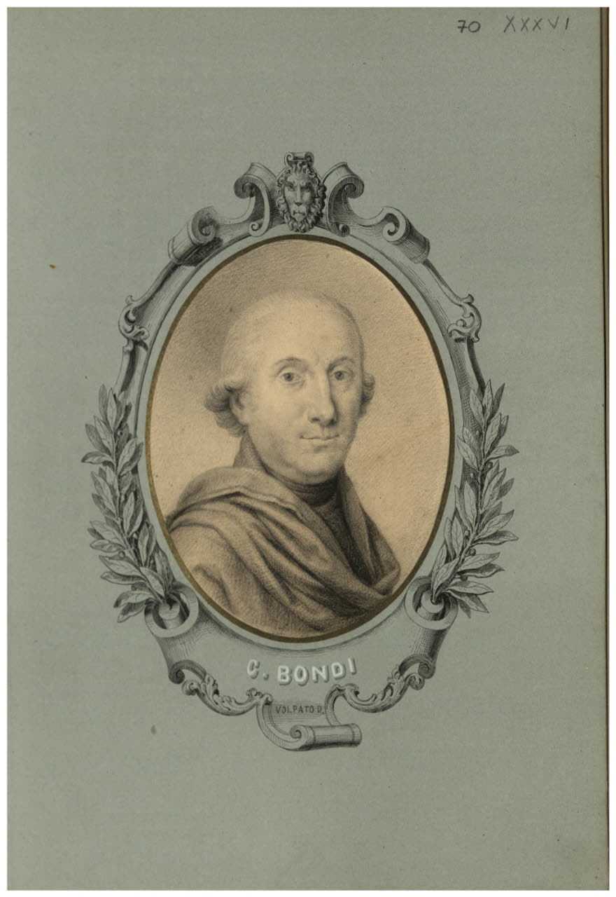 - NOTIZIE STORICO CRITICHE L'incisione derivata da questo disegno risulta tra i medaglioni che illustravano i "Cento ritratti di illustri italiani", Milano, Bettoni, 1825 (tav. 16). Chiaramente l'opera recepiva ritratti che erano stati commissionati dall'editore tempo prima, dato che comprende anche disegni di Giuseppe Bossi, morto nel 1815.\nSull'incisione, realizzata da Gaetano Bozza, è riportato come disegnatore il nome di Matteini e non quello di Volpato.