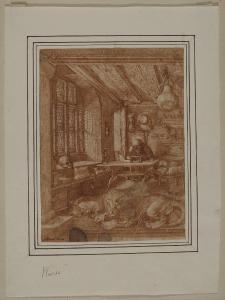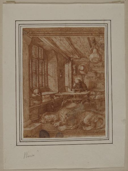 - NOTIZIE STORICO CRITICHE Proveniente dalla collezione Trivulzio, il disegno è entrato nelle collezioni civiche nel 1943. Si tratta di una copia a penna e inchiostro e nello stesso verso del celeberrimo San Girolamo nello studio inciso a bulino nel 1514 da Albrecht Dürer. Nell'inventario storico del museo il foglio è ascritto dubitativamente ad Antonius Wierix. Nell'inventario del 1814 dei beni di Alberico XII Barbiano di Belgioioso (trascritto in M. Forni, "Abitare da principe. Le residenze e le collezioni di Alberico XII Barbiano di Belgiojoso", 2020), nella cartella G è mezionato una "Copia a penna della stampa di Alberto Duro detta il S. Gerolamo della Zucca forse di Wierez" da identificare verosimilmente con il disegno in esame.