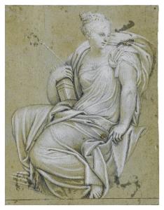 - NOTIZIE STORICO CRITICHE Identificato da Tietze (1944) come disegno di bottega, Arslan (1948) lo riconduce invece alla mano di Battista Zelotti, come da inventario. Zava Boccazzi (1970), Cocke (1984) e Gisolfi (1987) lo definiscono una copia anonima dall'affresco originale perduto di Villa Soranzo, quest'ultimo quasi sicuramente di mano dello Zelotti. Brugnolo Meloncelli (1992) attribuisce nuovamente il disegno a Zelotti stesso, ma ad oggi non risulta riconducibile ad una personalità specifica, nonostante l'identificazione come copia dagli affreschi della Camera C di Villa Soranzo a Castelfranco di mano dello Zelotti sia indubbia.