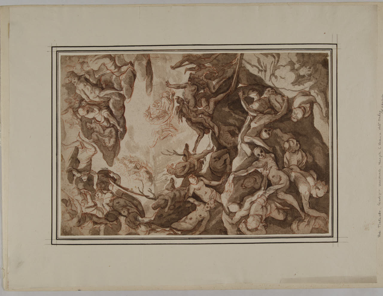 - NOTIZIE STORICO CRITICHE Proveniente dalla collezione Trivulzio, questo foglio entrò nelle collezioni civiche nel 1943 con un'attribuzione dubitativa ad un collaboratore di Zuccaro. Una nota manoscritta sul cartoncino di supporto di Konrad Oberhuber segnala che la composizione illustrata è derivata dal Giudizio universale di Tintoretto nella chiesa di Santa Maria dell'Orto a Venezia.