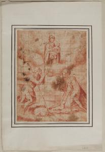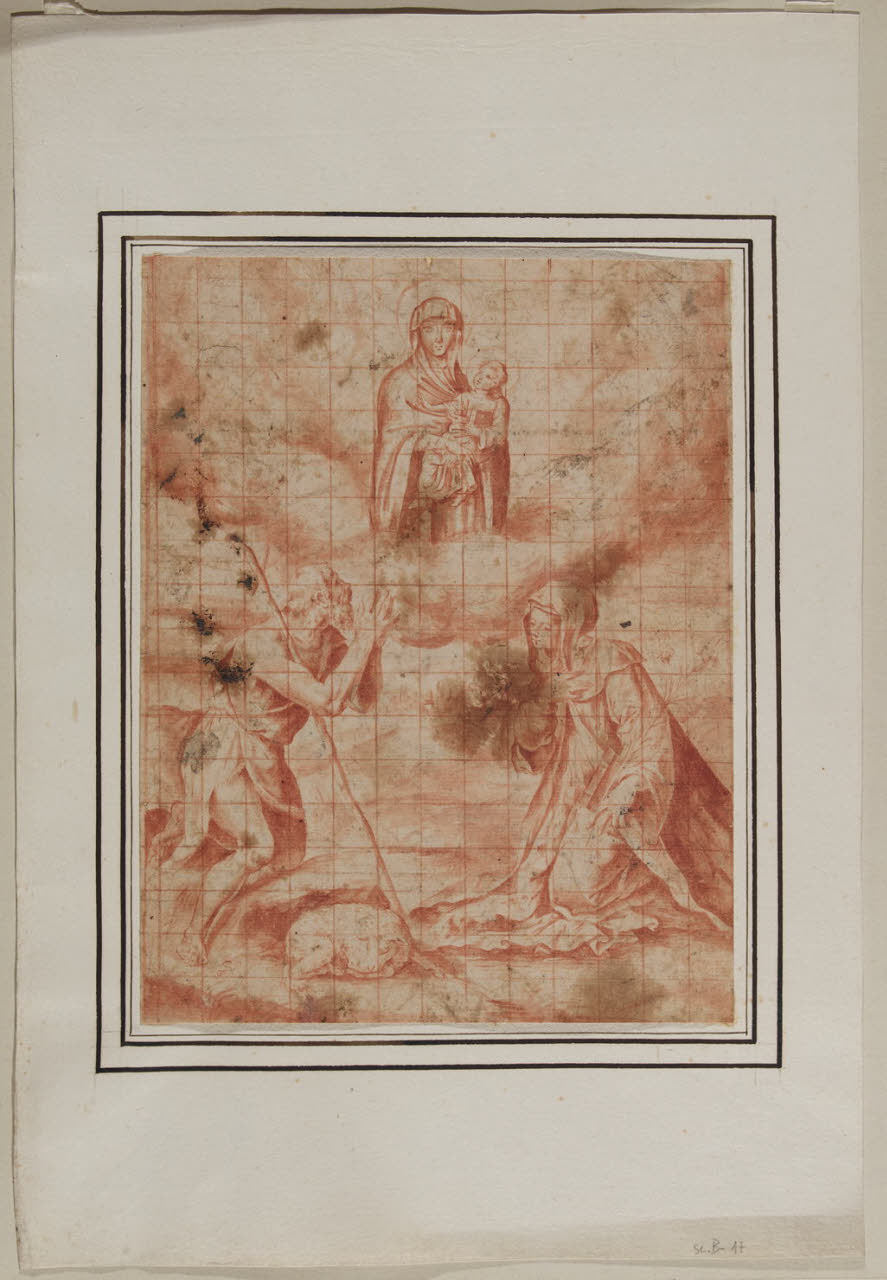 - NOTIZIE STORICO CRITICHE Già appartenuto alla collezione Trivulzio, questo piccolo foglio entrò nelle collezioni civiche nel 1943. Il disegno illustra l'Apparizione della Madonna con il Bambino a due santi che sono inginocchiati nella parte inferiore della composizione: a sinistra si può osservare un santo pellegrino orante ai cui piedi si trova un agnello dormiente (san Giovanni Battista?), mentre sulla destra si trova una santa monaca che tiene un libro e un ramo di gigli, probabilmente da identificarsi in santa Caterina da Siena. Tra i due santi, all'orizzonte, si riconosce il profilo di una città torrita. Eseguito a matita rossa, il foglio è inoltre quadrettato, segno che potrebbe essere stato impiegato per riportare la composizione su un altro supporto che resta tuttavia da identificare insieme al suo autore.