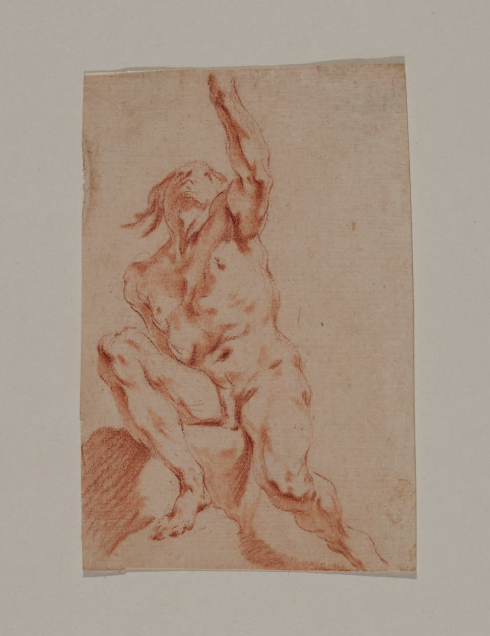 • NOTIZIE STORICO CRITICHE Il disegno in esame fa parte di un nucleo di cinquatuno fogli con Accademie virili a matita rossa, quasi tutti delle stesse dimensioni, pervenuti nelle civiche raccolte nel 1943 dalla raccolta Trivulzio. Già attribuiti ad anonimo del XVIII secolo nell'inventario museale, per questi disegni è stato avanzato, seppure in forma dubitativa, il nome di Federico Bencovich (1677-1753), autore di numerosi nudi d'accademia, la cui attività grafica resta tuttora oggetto di dibattito.