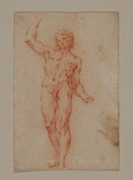 - NOTIZIE STORICO CRITICHE Il nucleo di disegni, corredati di un montaggio di collezione Barbiano di Belgioioso, è composto da una serie di "Accademie", studi di nudo virili raffigurati in pose diverse e colti da svariate angolature, dall'espressività marcata e dalle pose spesso dinoccolate. Il gruppo di fogli è stato attribuito, a livello inventariale, a Federico Bencovich (1677-1753), artista autore di numerose "Accademie virili" e la cui attività grafica è tuttora dibattuta. Il disegno è oggi sprovvisto di montaggio di collezione, la cui esistenza in passato è testimoniata da una matrice digitale in bianco e nero. \nNell'inventario del 1814 dei beni di Alberico XII Barbiano di Belgioioso (trascritto in M. Forni, "Abitare da principe. Le residenze e le collezioni di Alberico XII Barbiano di Belgiojoso", 2020), nella Cartella I "che contiene altri disegni" sono registrati "51 ignudi piccoli a lapis rosso", stimati £ 30: è ipotizzabile che si riferisca alla serie in analisi.