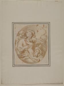 - NOTIZIE STORICO CRITICHE Già appartenuto alla collezione del Principe Alberico XII Barbiano di Belgioioso, questo disegno entrò nelle collezioni civiche nel 1943 per dono della famiglia Trivulzio. Il foglio illustra una Sacra Famiglia con San Giovannino entro una cornice ovale, e per il ductus sinuoso della penna combinato all'impiego della matita in sottotraccia e all'acquarellature in bistro, è stato avanzato il nome dell'artista genovese Domenico Piola (parere orale Marco Riccomini, 2009).
