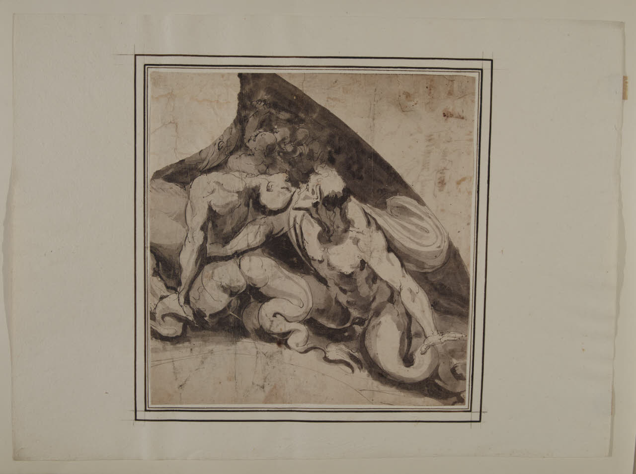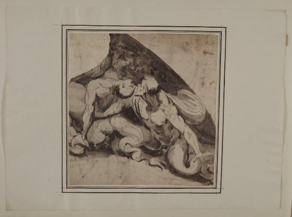 - NOTIZIE STORICO CRITICHE Già attribuito nell'inventario storico del museo ad anonimo del XVII secolo, il foglio è stato recentemente accostato alla produzione giovanile di Luca Cambiaso. La composizione a monocromo mostra, seppur in maniera frammentaria, una lotta di tritoni, mentre le linee di contorno stese a penna lasciano supporre che il decoro fosse destinato alla vela di una lunetta. La scena con un tritone che afferra per un braccio l'avversario e sullo sfondo altre figure che brandiscono un bastone si caratterizza per il forte dinamismo e plasticità delle forme, a cui si aggiungono soluzioni compositive inedite, come il tentativo di sfondamento dello spazio della mano del tritone protesa verso lo spettatore o la testa flessa all'indietro dell'altra figura in primo piano. Simili espedienti figurativi si ammirano nei primi lavori pittorici del Cambiaso e in particolare nella decorazione con scene della storia antica e della mitologia di Palazzo Doria-Spinola a Genova, affrescato nel 1544, in cui si ritrovano anche lotte di tritoni che popolano i pennacchi delle lunette dei vasti saloni. La forza di linguaggio di Luca Cambiaso espressa in questo ciclo decorativo è preannunciata dalla pala di San Cipriano in Polcevera eseguita in collaborazione con il padre Giovanni (Rotondi 1956, p. 31).