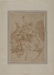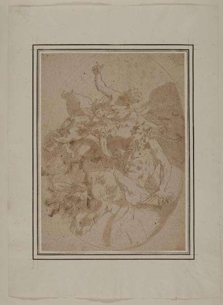 - NOTIZIE STORICO CRITICHE In basso a destra entro una cornice ovale si trova Pan seduto sul globo, simboleggiante il Mondo, che con una mano prende i frutti offerti da una figura collocata più in alto tra le nubi, probabilmente da identificarsi con la Felicità Pubblica o con l'Abbondanza. Il ductus rapido della penna abbinato alle campiture dell'inchiostro steso a pennello hanno fatto avanzare il nome del fiorentino Sebastiano Galeotti per questo disegno, il cui soggetto è prossimo al "Mondo assiste al trionfo della Felicità Pubblica tra la Prudenza e il Consiglio", tema che l'artista replicò con minime varianti in diversi luoghi e momenti della sua fortunata carriera nel nord Italia (cfr. Dugoni 2001, pp. 77-91). Consonanze stilistiche e iconografiche permettono di accostare il disegno del Castello Sforzesco a due fogli oggi agli Uffizi (inv. 2887 S e inv. 7199 S) (cfr. Dugoni 2001, p. 218, n. D1 e p. 236-237 n. D95).