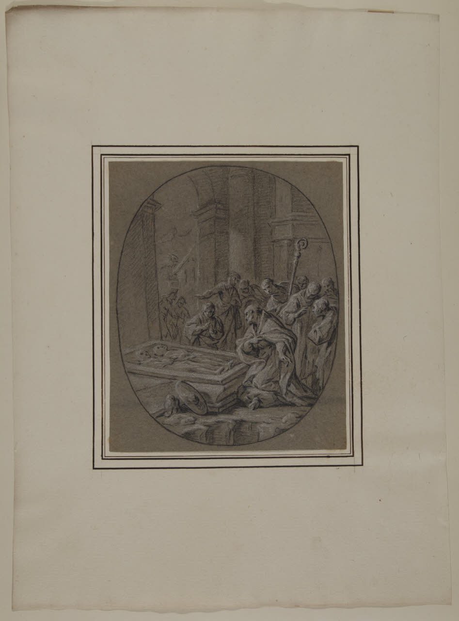 - NOTIZIE STORICO CRITICHE La serie è costituita da venti disegni con episodi della "Vita di sant'Ambrogio", stagliati come bassorilievi entro ovati. Come indicato dalla Garberi nel suo saggio (1993), si tratta di studi definitivi per i venti piccoli medaglioni a monocromo realizzati ad affresco nel soffitto della cripta della basilica di Sant'Ambrogio. Gli affreschi, dieci dei quali distrutti nei bombardamenti del 1943, sono opera di Giambattista Sassi, incorniciati da fregi in stucco di Giambattista Aliprandi; l'intero apparato decorativo è databile al 1730 circa. I disegni sono improntati a un linguaggio raffinato, morbido e sciolto, con guizzi luminosi dati dal gessetto bianco; la fresca immediatezza, l'elegante virtuosismo, la stesura rapida ed estrosa sono caratteristiche tipiche del linguaggio barocchetto riscontrabili nell'attività artistica del Sassi soprattutto negli anni prossimi al terzo decennio del XVIII secolo.\nIl foglio illustra il rinvenimento, da parte di Ambrogio, delle salme dei martiri Gervaso e Protaso.\nNell'inventario del 1814 dei beni di Alberico XII Barbiano di Belgioioso (trascritto in M. Forni, "Abitare da principe. Le residenze e le collezioni di Alberico XII Barbiano di Belgiojoso", 2020), nella Cartella I "che contiene altri disegni" sono registrati "20 altri rappresentanti la vita di S. Ambrogio", stimati £ 15: plausibile che si riferisca proprio alla serie in analisi.