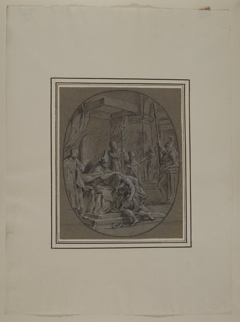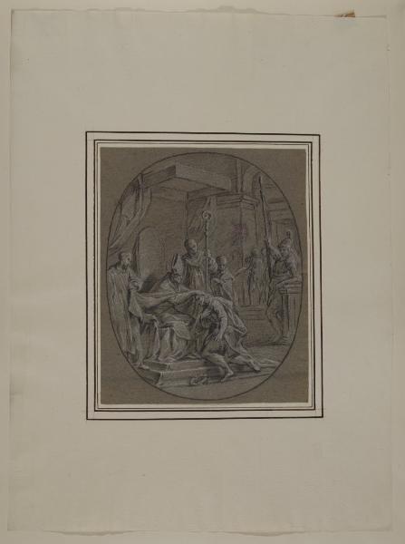 - NOTIZIE STORICO CRITICHE La serie è costituita da venti disegni con episodi della "Vita di sant'Ambrogio", stagliati come bassorilievi entro ovati. Come indicato dalla Garberi nel suo saggio (1993), si tratta di studi definitivi per i venti piccoli medaglioni a monocromo realizzati ad affresco nel soffitto della cripta della basilica di Sant'Ambrogio. Gli affreschi, dieci dei quali distrutti nei bombardamenti del 1943, sono opera di Giambattista Sassi, incorniciati da fregi in stucco di Giambattista Aliprandi; l'intero apparato decorativo è databile al 1730 circa. I disegni sono improntati a un linguaggio raffinato, morbido e sciolto, con guizzi luminosi dati dal gessetto bianco; la fresca immediatezza, l'elegante virtuosismo, la stesura rapida ed estrosa sono caratteristiche tipiche del linguaggio barocchetto riscontrabili nell'attività artistica del Sassi soprattutto negli anni prossimi al terzo decennio del XVIII secolo.\nIl foglio mostra un incontro tra il vescovo Ambrogio e l'imperatore Teodosio.\nNell'inventario del 1814 dei beni di Alberico XII Barbiano di Belgioioso (trascritto in M. Forni, "Abitare da principe. Le residenze e le collezioni di Alberico XII Barbiano di Belgiojoso", 2020), nella Cartella I "che contiene altri disegni" sono registrati "20 altri rappresentanti la vita di S. Ambrogio", stimati £ 15: plausibile che si riferisca proprio alla serie in analisi.