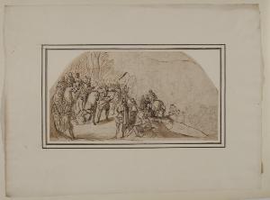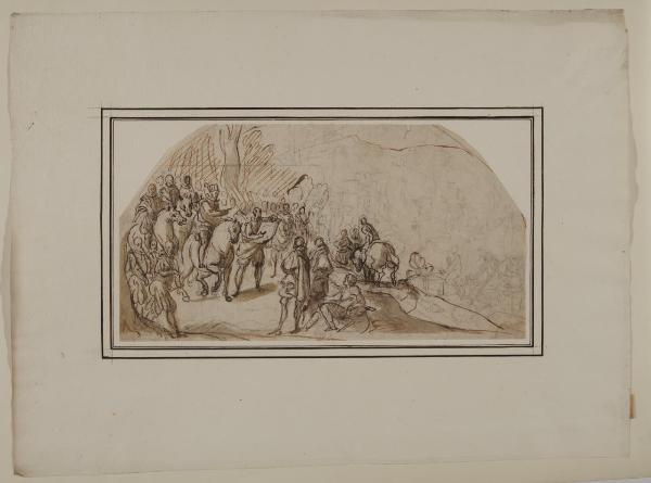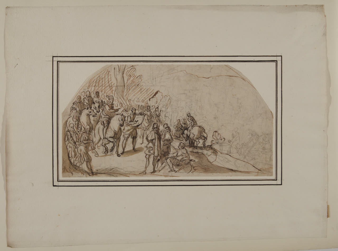 - NOTIZIE STORICO CRITICHE Il foglio illustra probabilmente un soggetto storico: presso un albero si trova un condottiero a cavallo, circondato da armati a piedi e a cavallo guarda foglio che gli vien mostrato da uomo alla sinistra del suo cavallo; a sinistra si scorgono alcune figure abbozzate.