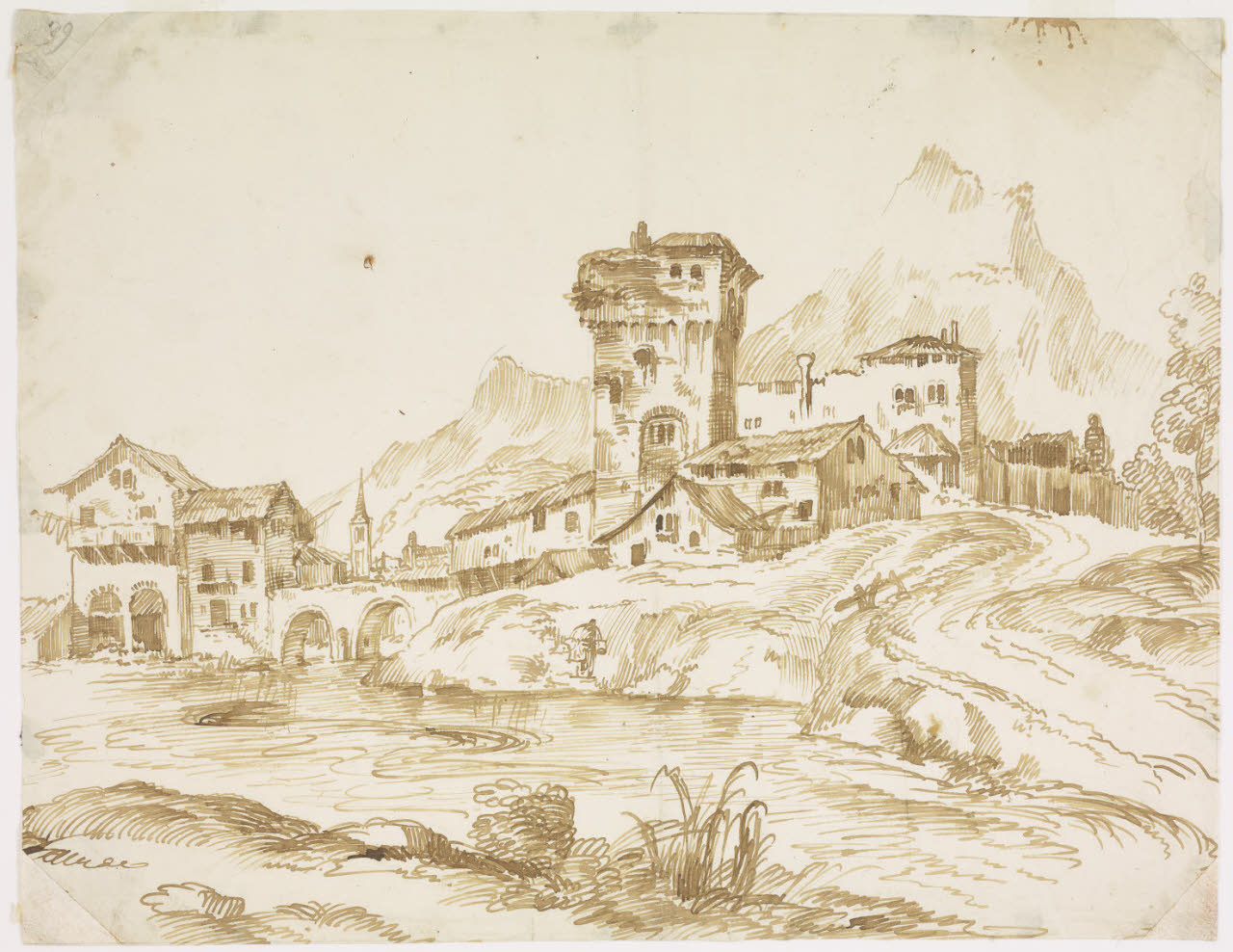 - NOTIZIE STORICO CRITICHE Proveniente dalla raccolta Gaffuri, questo disegno di paesaggio a penna e inchiostro è stato attribuito a Marco Ricci da Precerutti Garberi (1969). La studiosa associa l'opera in esame ad una serie di fogli oggi conservati presso l'Ashmolean Museum di Oxford, il Museo Correr di Venezia e altri musei nei quali è ravvisabile la forte vena d'ispirazione del Ricci desunta dai paesaggi incisi di Tiziano e Domenico Campagnola.