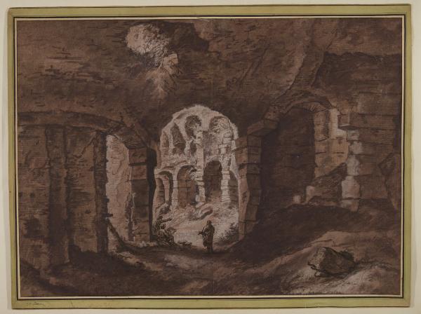- NOTIZIE STORICO CRITICHE Già appartenuto alla raccolta Trivulzio, questo foglio con una veduta di grandiose rovine antiche entrò nelle collezioni civiche nel 1943. Il disegno presenta un montaggio di collezione su cartoncino acquarellato in verde chiaro con una doppia cornice a penna, diverso da quello che caratterizzò la famosa raccolta milanese, segno che si tratti di una scelta collezionistica di un precedente proprietario dell'opera.