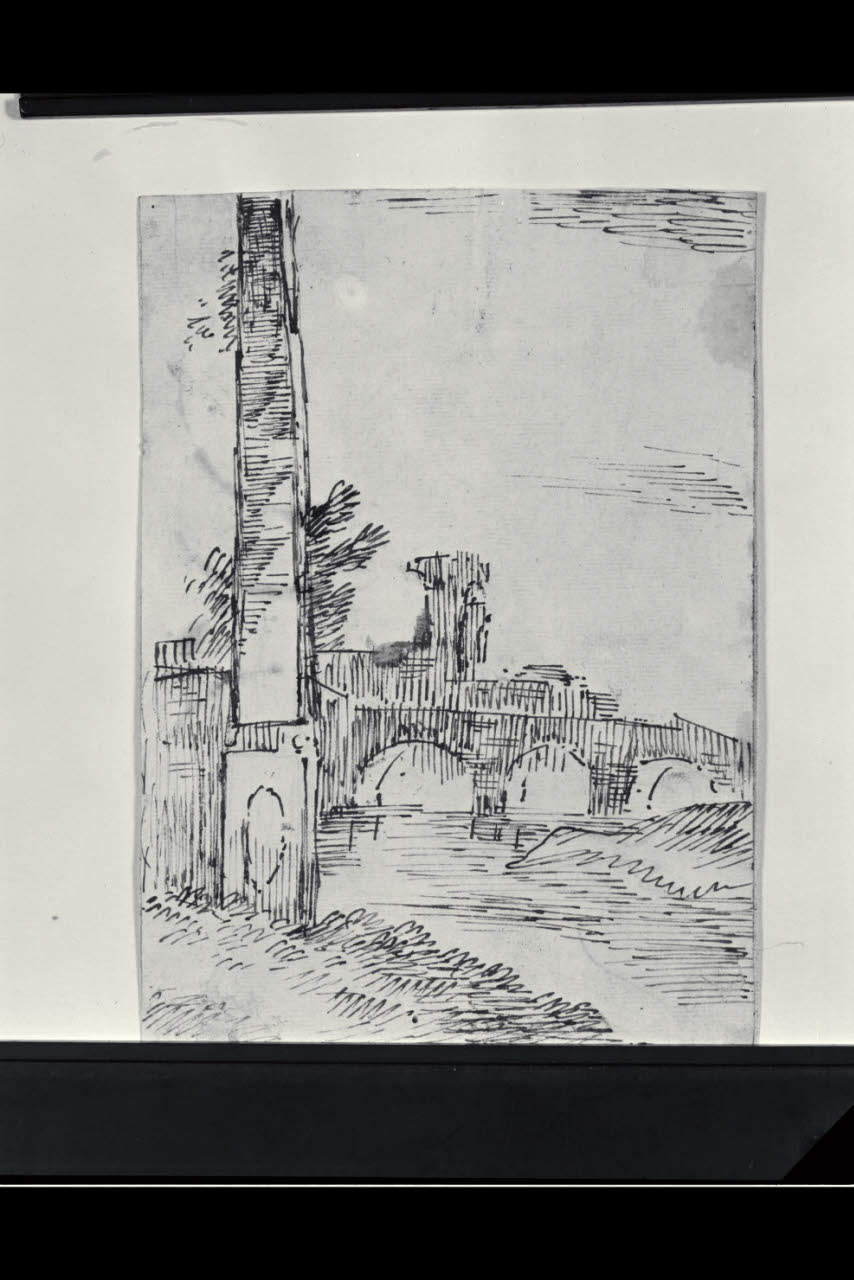 - NOTIZIE STORICO CRITICHE Il disegno, pubblicato per la prima volta da Brambilla Ranise (2000), sarebbe da ascrivere all'ancora poco noto pittore veneziano Pietro Brancaleoni attivo tra il 1712 e il 1737, come suggerisce una nota manoscritta di Giacomo Carrara sul verso del foglio. Questo paesaggio con rovine e un ponte è condotto con uno stile rapido e sicuro della penna e condivide con un altro foglio del Castello Sforzesco sicuramente del Brancaleoni datato 1727 (inv. A 389/1 Recto) il medesimo impianto compositivo con il caratteristico primo piano a sinistra variamente occupato con elementi architettonici in rovina.