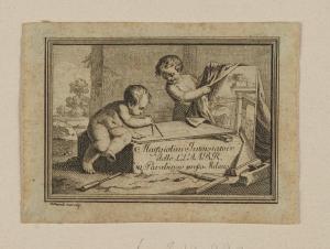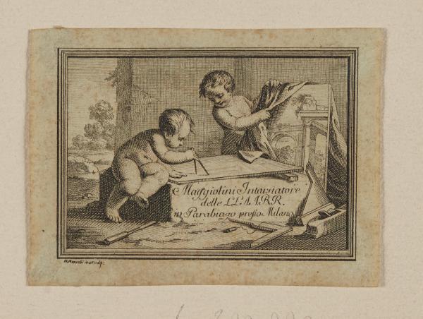- NOTIZIE STORICO CRITICHE Si tratta del biglietto da visita di Maggiolini. Lo si ritrova, a mo' di firma, incollato nell'interno di alcuni mobili dell'ebanista. Nel fondo si conservano dei disegni con la scritta "Mantelli", che sembrano corrispondere allo stile della presente opera. Mantelli, a quanto scrive su questa carta, disegnò e incise la piccola composizione, inoltre sembra essere autore di figure allegoriche palesemente destinate a tarsie di mobili. Ma nessuna di queste invenzioni pare sia stata utilizzata. Per altri disegni del Mantelli si vedano i fogli: A 41, B 170, B 170 bis, B 170 ter e poi C 74, C 75, C 79, C 80, C 81. C'è da chiedersi se il foglio B 20, un bozzetto per il biglietto da visita di Carlo Cantaluppi, non possa essere di mano di Girolamo Mantelli.\n[Beretti - Gonzalez Palacios 2014]