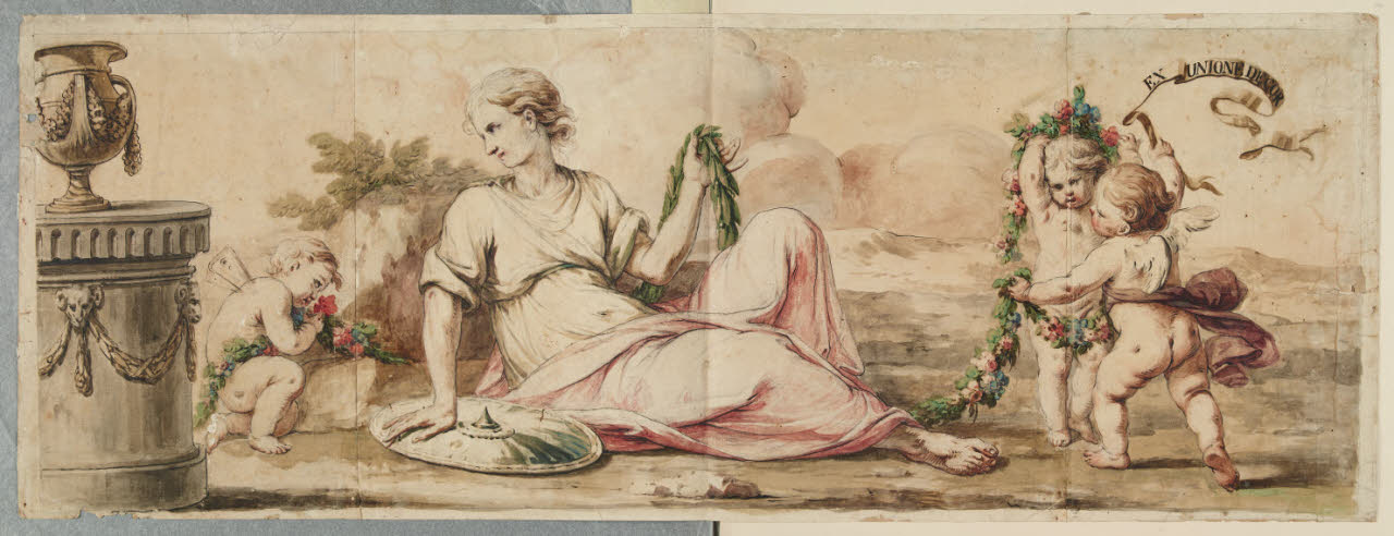 - NOTIZIE STORICO CRITICHE I due disegni (C 10; C 11), che formano un ideale pendant, furono ideati da Andrea Appiani per Giuseppe Maggiolini e utilizzati per i grandi pannelli frontali intarsiati di una coppia di commode eseguite per Antonio Greppi nel 1777. Attualmente un mobile si trova in collezione privata (già collezione Bice Greppi Belgiojoso, per il quale fu usato il foglio C 11), il secondo è conservato al Castello Sforzesco (inv. 344; foglio di riferimento C 10). I disegni, pur trattandosi di lavori giovanili, come dimostrerebbero le sgrammaticature di carattere anatomico, celano una radice letteraria che trae origine dai lavori di Giuseppe Parini.