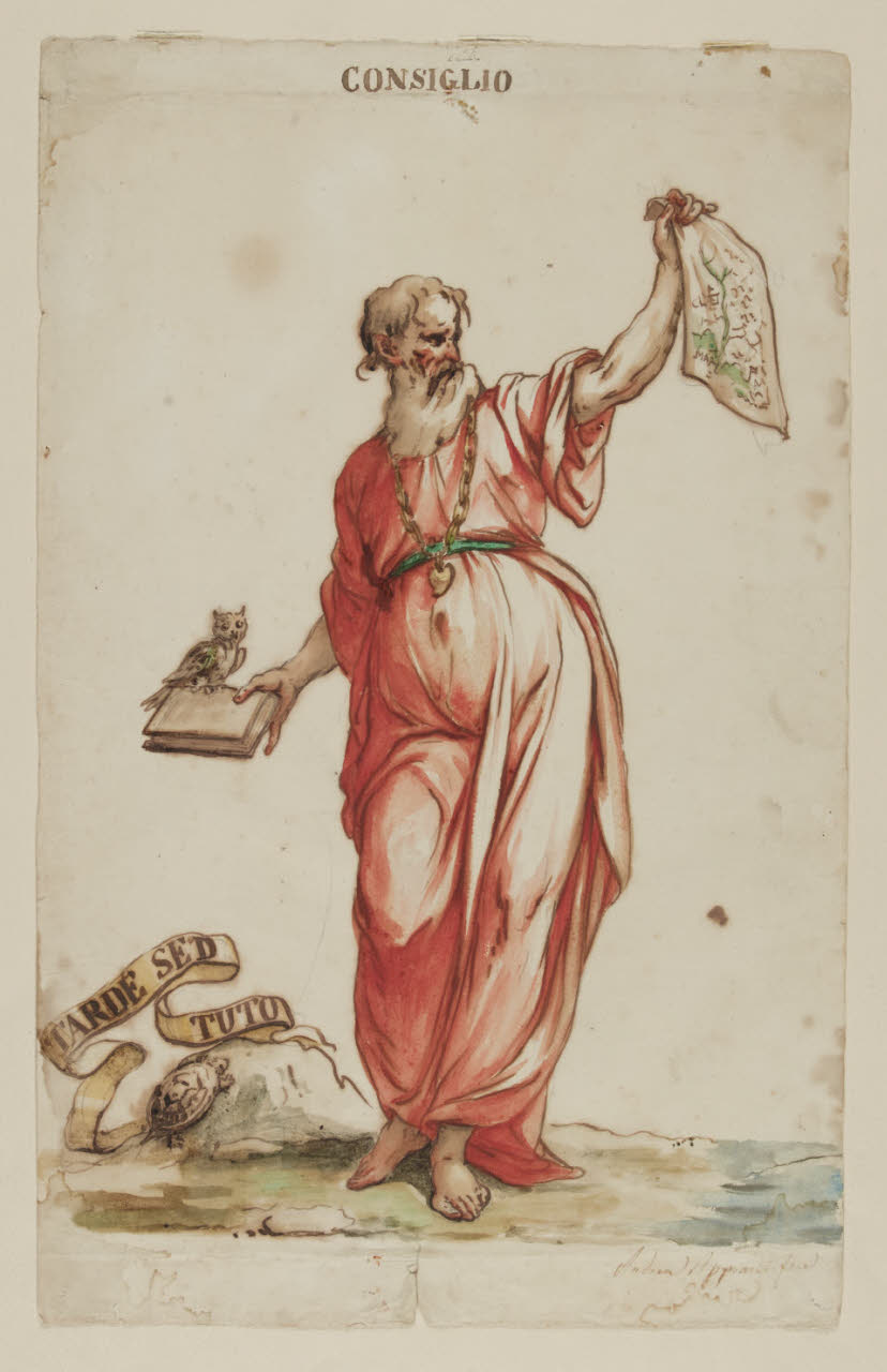 - NOTIZIE STORICO CRITICHE Le quattro figure furono ideate per i fianchi delle commode eseguite per Antonio Greppi nel 1777, uno in collezione privata (già collezione Bice Greppi Belgiojoso; fogli C 13 e C 15) e il secondo conservato al Castello Sforzesco (inv. 344; fogli C 12 e C 14). Beretti per primo ha cercato di individuare nell'Iconologia di Cesare Ripa le fonti per i soggetti. Ne è emersa una ipotetica derivazione, seppur parziale: ogni figura, infatti, si discosta dal modello di Ripa per un dettaglio preciso, che Beretti e González-Palacios così riassumono: "il Consiglio non ha il braccio destro alzato; la Liberalità ha la sua cornucopia sulla destra rovesciata ed è mancante dell'aquila sul capo; il Premio è pressoché uguale: presenta una veste lunga e il braccio destro alzato; la Prudenza, infine, è uguale ma omette la figura del cervo ai piedi della donna" (Beretti, González-Palacios, 2014, p. 241 n. C 12). Il foglio presenta un'iscrizione considerata autografa.