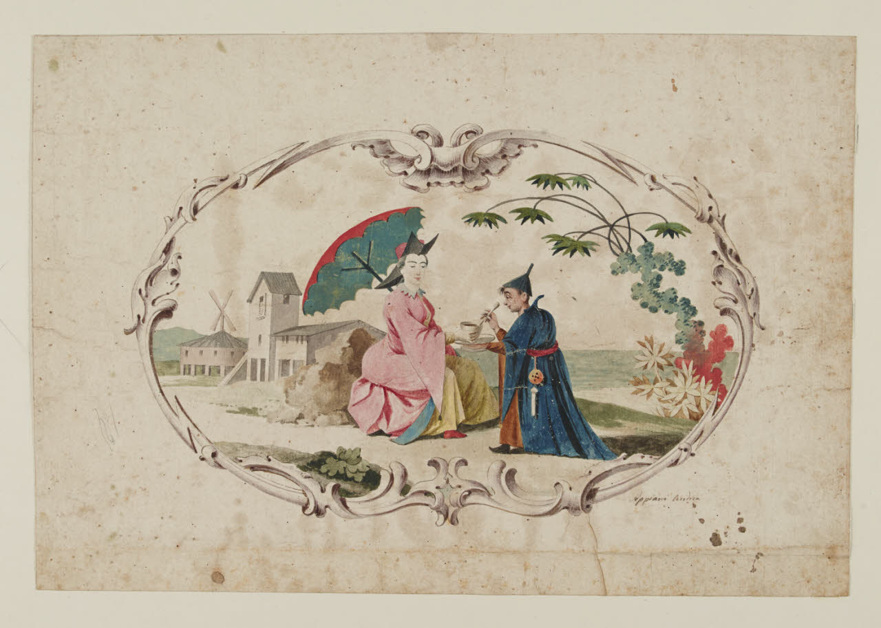 - NOTIZIE STORICO CRITICHE Questo disegno e il C 23|2 presentano le stesse incorniciature rococò che compaiono sui fogli B 506 e B 507 (raffiguranti una canestra e un mazzolino di fiori). Le immagini sui fogli qui esaminati, probabilmente tratte da stampe d'oltralpe, sono state utilizzate sul fronte e sul piano d'appoggio di un comò delle Civiche Raccolte d'Arte milanesi (Inv. 346). Purtroppo la cronologia di Giuseppe Maggiolini resta poco chiara e non conosciamo la data di esecuzione di quel mobile: è comunque verosimile che esso sia anteriore alla scrivania eseguita da Maggiolini per Maria Teresa, che sappiamo essere arrivata a Vienna nel giugno 1773. Tutto questo non ci consente di affermare che la scritta "Appiani Andrea" sui presenti fogli corrisponda a verità, poichè attorno al 1770 Appiani non aveva più di 15 anni e non risulta documentata la sua attività a quest'epoca presso Giuseppe Maggiolini.\n[Beretti - Gonzalez Palacios 2014]