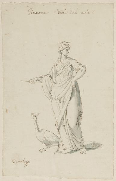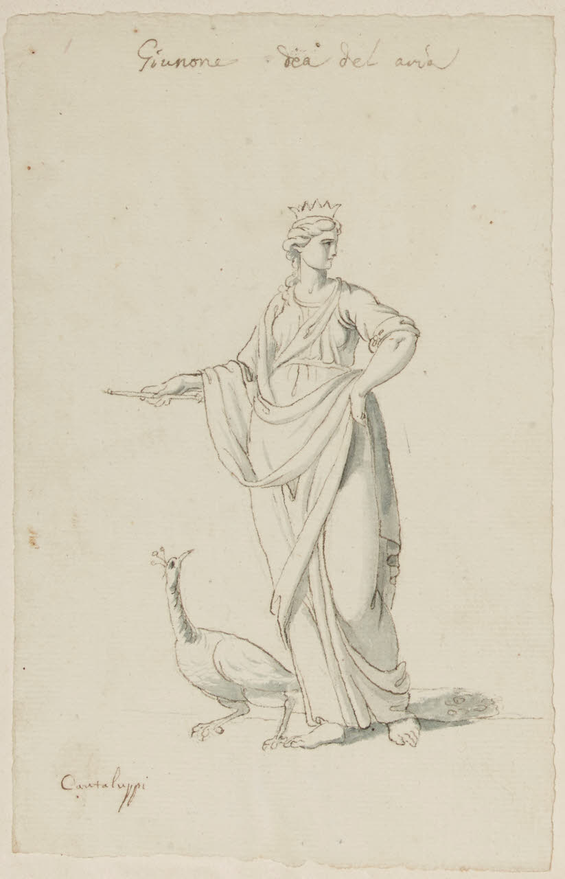- NOTIZIE STORICO CRITICHE Questo disegno fa parte di un gruppo di otto destinati a due comodini: B 25, B 26, C 28 e C 29 (in orizzontale); B 27, B 28, B 30, B 31 (in verticale). Finora era stato identificato soltanto un comodino apparso ad un'asta di Christie's a Roma il 22-23 aprile 1986. Quando questo catalogo era in bozze abbiamo avuto notizia della comparsa sul mercato antiquario del secondo comodino, che non abbiamo però avuto modo di esaminare. I fogli raffigurano la Terra, l'Inverno, Nettuno, Cerere, Flora, Giunone, Vulcano e Bacco, vale a dire gli Elementi e le Stagioni. Tutti questi disegni, indubbiamente della stessa mano, potrebbero essere opera di quel Carlo Cantaluppi che compare spesso nel fondo, perlopiù con lavori di qualità assai modesta. D'altra parte tutti gli otto fogli recano una scritta (non una firma) col suo nome.\n[Beretti - Gonzalez Palacios 2014]