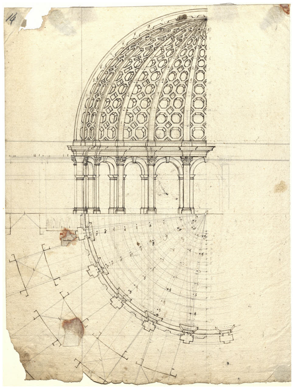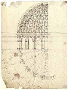 Sezione di un quarto di cupola su tamburo e proiezione in pianta