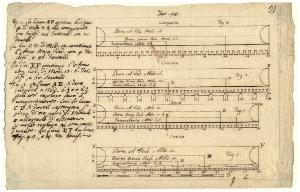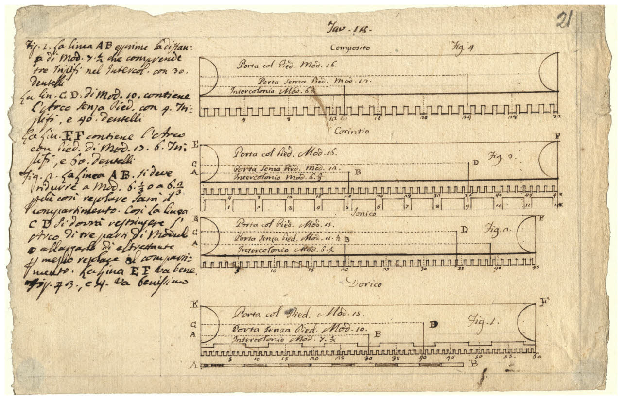 Studio modulare su schemi grafici delle colonne dorica, ionica, corinzia e composita con scritte esplicative