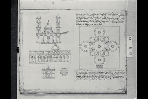 Prospetto, sezione e studi per una chiesa e pianta di un tempietto