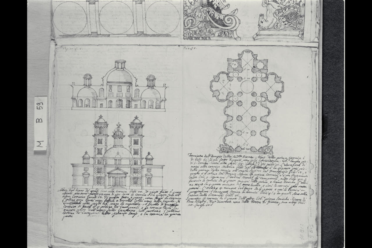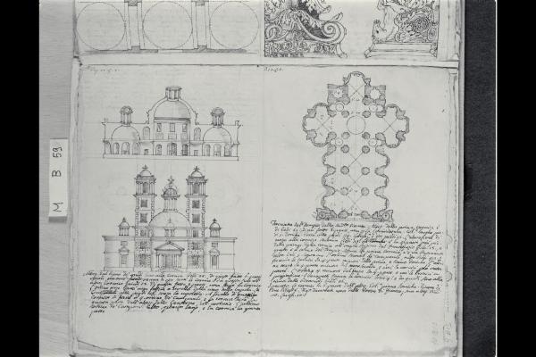 Sezione, prospetto e pianta di una chiesa