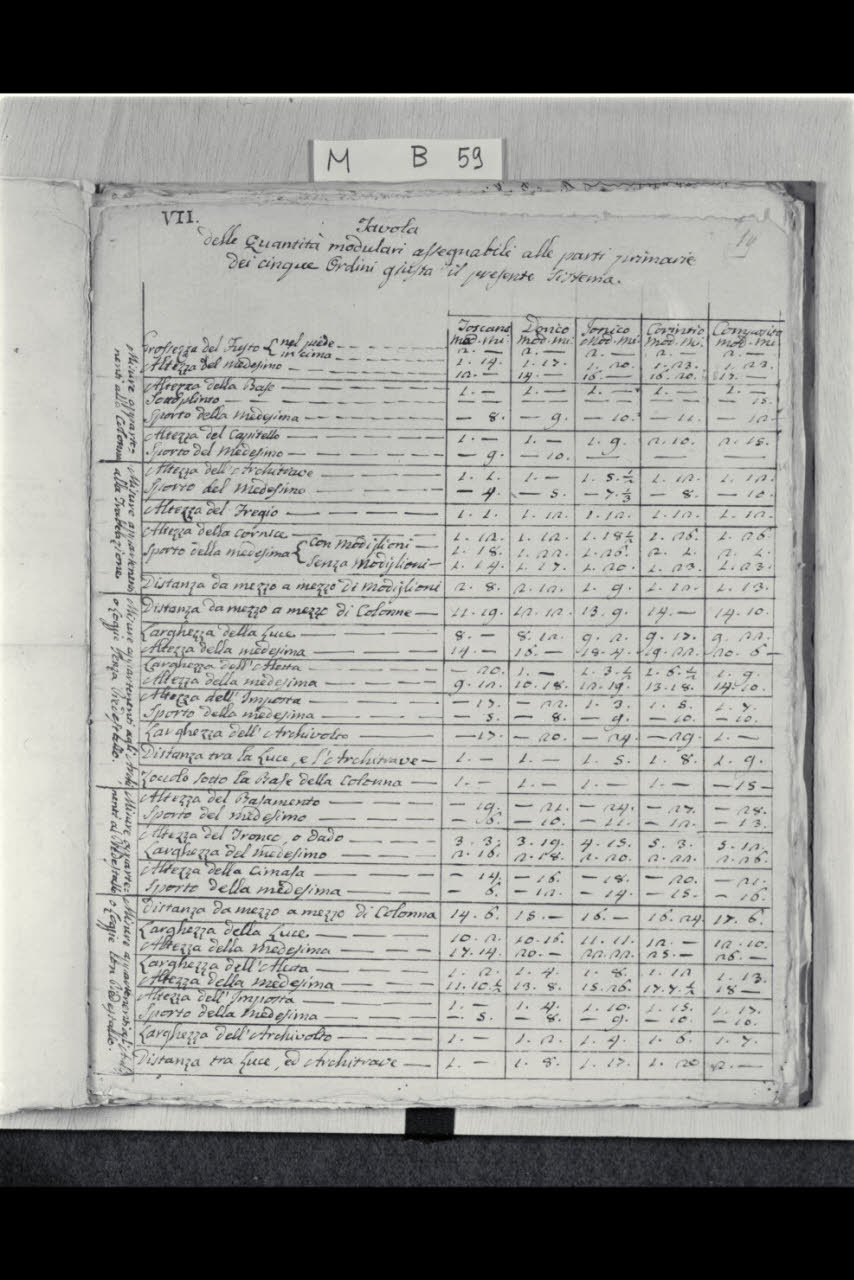Tavola delle quantità modulari assegnabili alle parti primarie dei cinque ordini giusta il seguente sistema