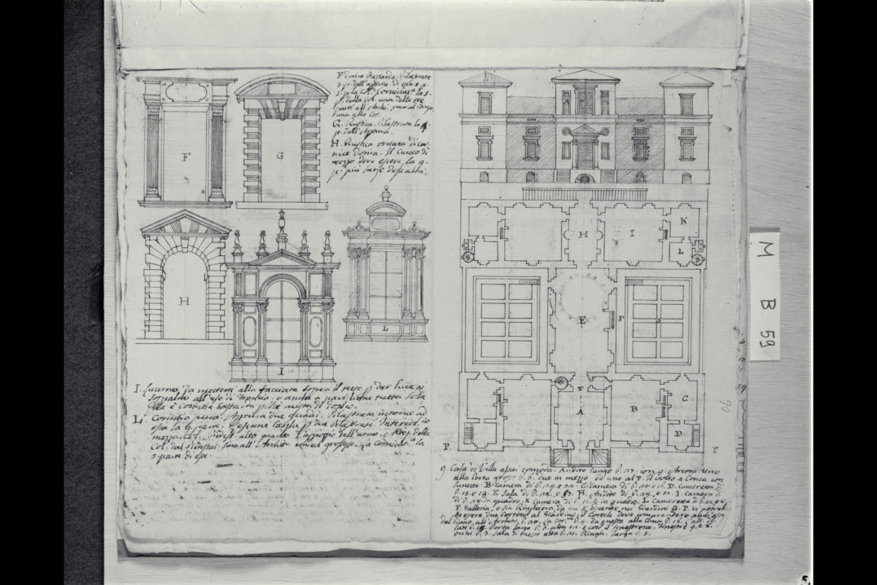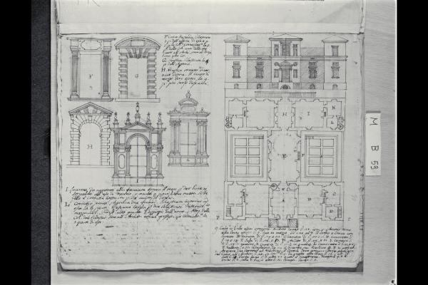 Tre prospetti di portali, due prospetti di altari, prospetto della facciata e pianta di una villa