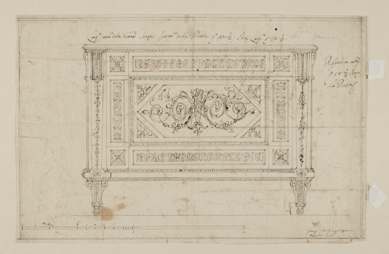 - NOTIZIE STORICO CRITICHE La scritta in basso a destra è più un ricordo che una firma, e dunque non possiamo affermare che questo disegno si debba a Giuseppe Gerli anziché al fratello Agostino. Il foglio appare della stessa mano di altri due disegni che crediamo di Agostino Gerli (B 194, B 240). L'impostazione ricorda anche i progetti relativi al comò del Marchese Serra di Genova (F 3). Stando alla scritta in calce al disegno, il mobile sarebbe stato fatto per "Carpani" ed eseguito dal Maggiolini. Abbiamo notizie di un Carpani che forse è quello in questione: Giuseppe Carpani (1752-1825), avvocato, scrittore, poeta (anche dialettale) amico del Parini, direttore della Gazzetta di Milano dal 1792 al 1796 e fedele all'Arciduca Ferdinando d'Asburgo, che seguì a Vienna dopo la caduta degli austriaci. Esiste un mobile che corrisponde a questo disegno presso il Musée National de la Maison Bonaparte ad Ajaccio, per quanto non in buono stato di conservazione (Beretti 2010, p. 417).\n[Beretti - Gonzalez Palacios 2014]