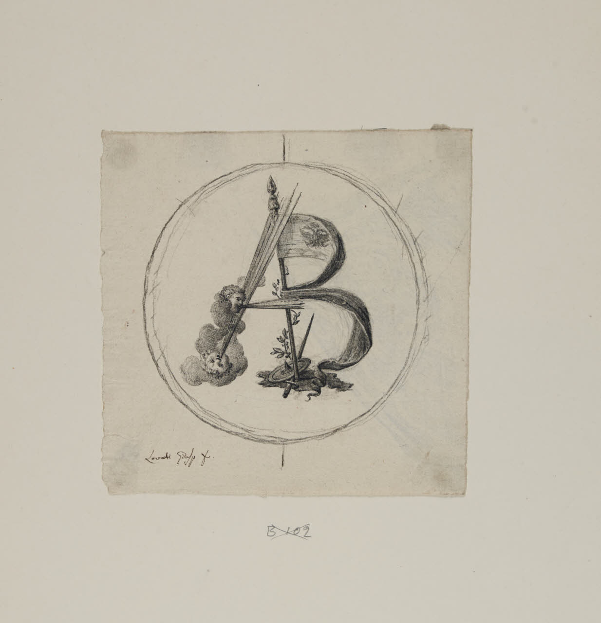 - NOTIZIE STORICO CRITICHE Il disegno, che sembra di meno di Giuseppe Levati (la lettera F che segue la scritta col suo nome è un rafforzativo), si riferisce crediamo al monogramma del principe Alberico Barbiano di Belgiojoso d'Este (1725-1813), Consigliere Imperiale, Generale, Cavaliere del Toson d'oro e della Corona Ferrea ed uno dei più facoltosi uomini della sua epoca, di cui, va però detto, non si fa menzione nel Fondo. La bandiera include l'aquila bicipite degli Asburgo.\n[Beretti - Gonzalez Palacios 2014]