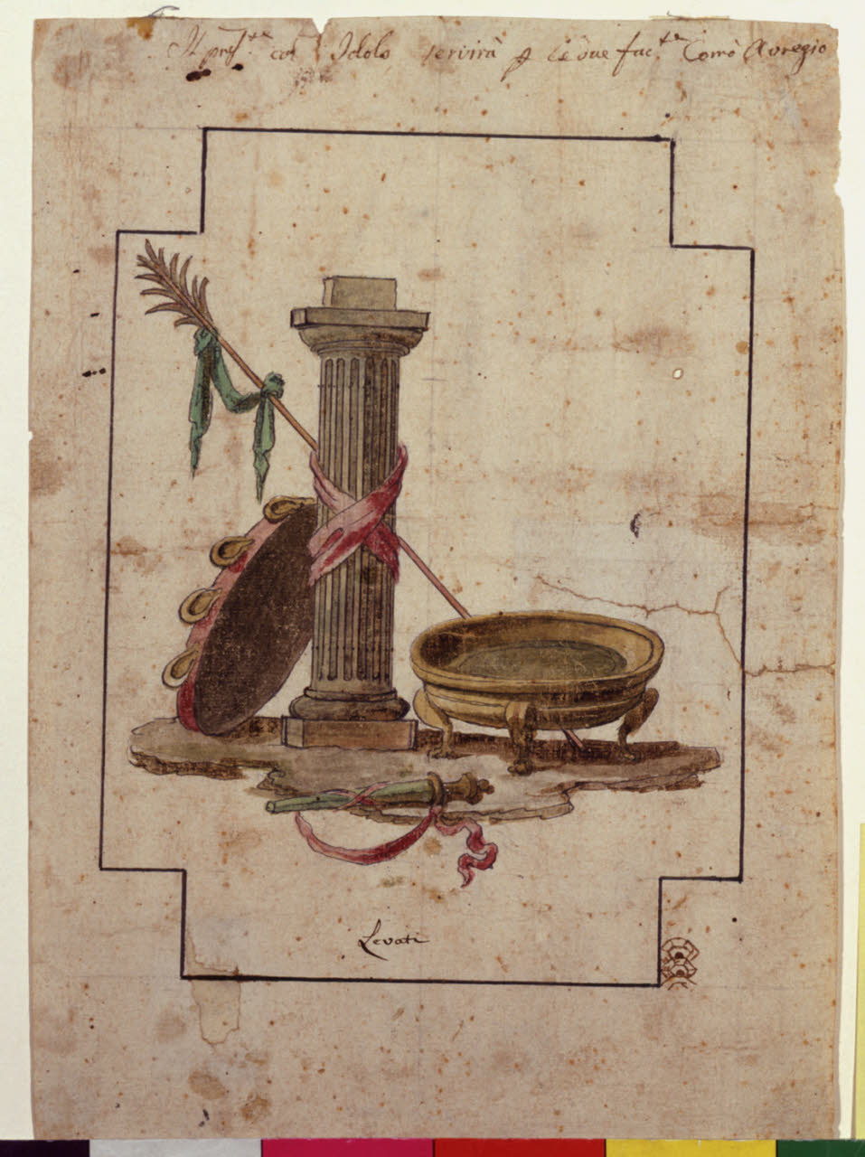 - NOTIZIE STORICO CRITICHE Questo disegno, fra i più felici di Giuseppe Levati assieme ai tre numeri successivi, è una trascrizione non del tutto fedele di una tavola de Le antichità di Ercolano esposte, Antiche pitture vol. III, Napoli, 1762.\nI quattro fogli vennero utilizzati nella bottega del Maggiolini più volte. Ad esempio nel secrétaire della Palazzina di Stupinigi proveniente dalla Reggia di Sala o in quella a Milano presso Palazzo Reale, Soprintendenza ai Beni architettonici (Beretti 1994, p. 114).\n[Beretti - Gonzalez Palacios 2014]