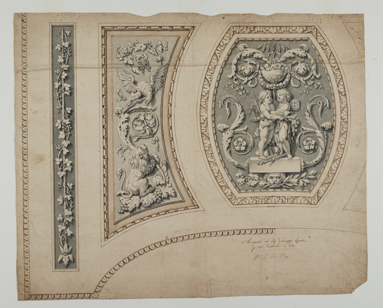 - NOTIZIE STORICO CRITICHE Foglio di eccellente qualità, di mano di Giuseppe Levati. L'iscrizione sembra corrispondere al vero, come implica l'iconografia sullo scomparto centrale: due putti con i simboli della Giustizia e dell'Abbondanza; ai loro piedi, una corona imperiale e lo scettro. Dunque la datazione dovrebbe essere anteriore al 1796 quando il governo austriaco venne a cessare. Per lo stesso mobile si veda il foglio C 70.\n[Beretti - Gonzalez Palacios 2014]