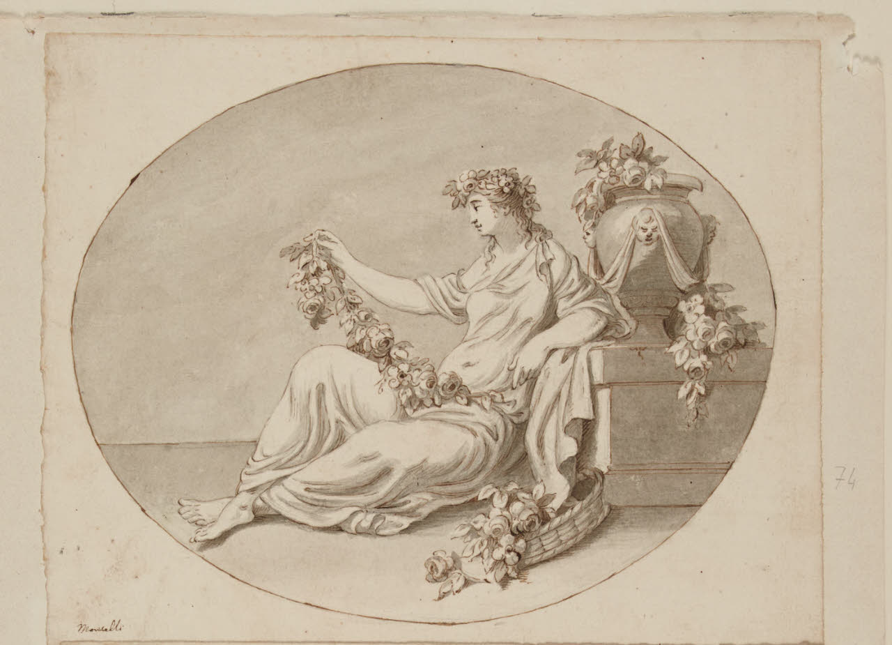 - NOTIZIE STORICO CRITICHE I quattro disegno (C 74, C 75, C 79, C 80), tutti recanti il cognome Mantelli, sono destinati a decorazioni di mobili. Il presente foglio e il C 79 sono allegorie della Primavera e dell'Estate, mentre il C 75 e il C 80 riguardano la Pittura e la Scultura. Tutti e quattro presentano le stesse dimensioni e lo stesso gusto tra il bucolico e il neoclassico, che richiama le idee di Angelica Kauffmann, assai note all'epoca. L'attribuzione a Mantelli, del quale si conservano pochi fogli nel Fondo, sembra convincente. Il C 74 e il C 79 furono impiegati per il fronte di due comò esposti alla Mostra commemorativa di Giuseppe Maggiolini del 1938 (cat. 94).\n[Beretti - Gonzalez Palacios 2014]