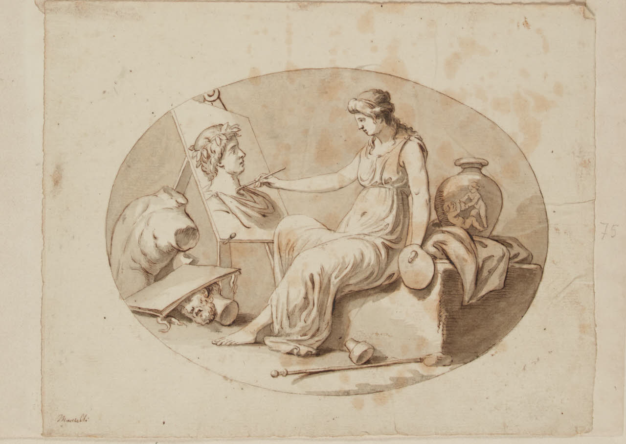 - NOTIZIE STORICO CRITICHE I quattro disegno (C 74, C 75, C 79, C 80), tutti recanti il cognome Mantelli, sono destinati a decorazioni di mobili. Il presente foglio e il C 79 sono allegorie della Primavera e dell'Estate, mentre il C 75 e il C 80 riguardano la Pittura e la Scultura. Tutti e quattro presentano le stesse dimensioni e lo stesso gusto tra il bucolico e il neoclassico, che richiama le idee di Angelica Kauffmann, assai note all'epoca. L'attribuzione a Mantelli, del quale si conservano pochi fogli nel Fondo, sembra convincente. Il C 74 e il C 79 furono impiegati per il fronte di due comò esposti alla Mostra commemorativa di Giuseppe Maggiolini del 1938 (cat. 94).\n[Beretti - Gonzalez Palacios 2014]