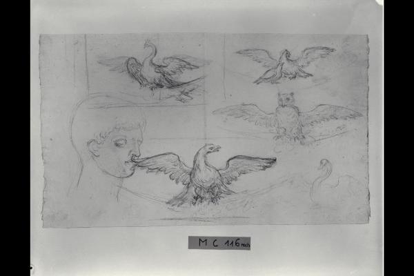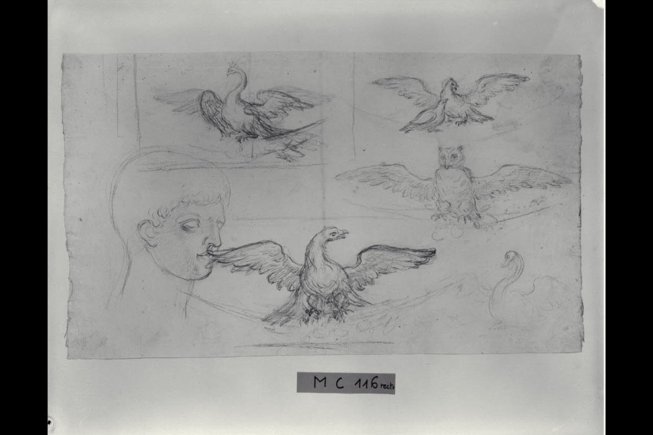 Un pavone, due colombi, un gufo, un'aquila, un cigno e una testa maschile