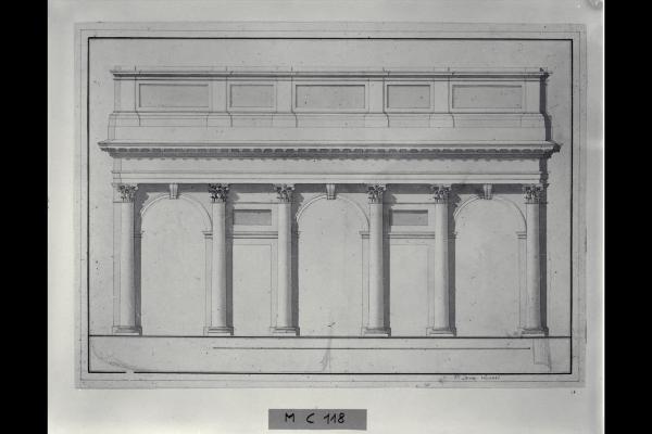 Prospetto a tre fornici con attico su un foglio a trompe-l'oeil