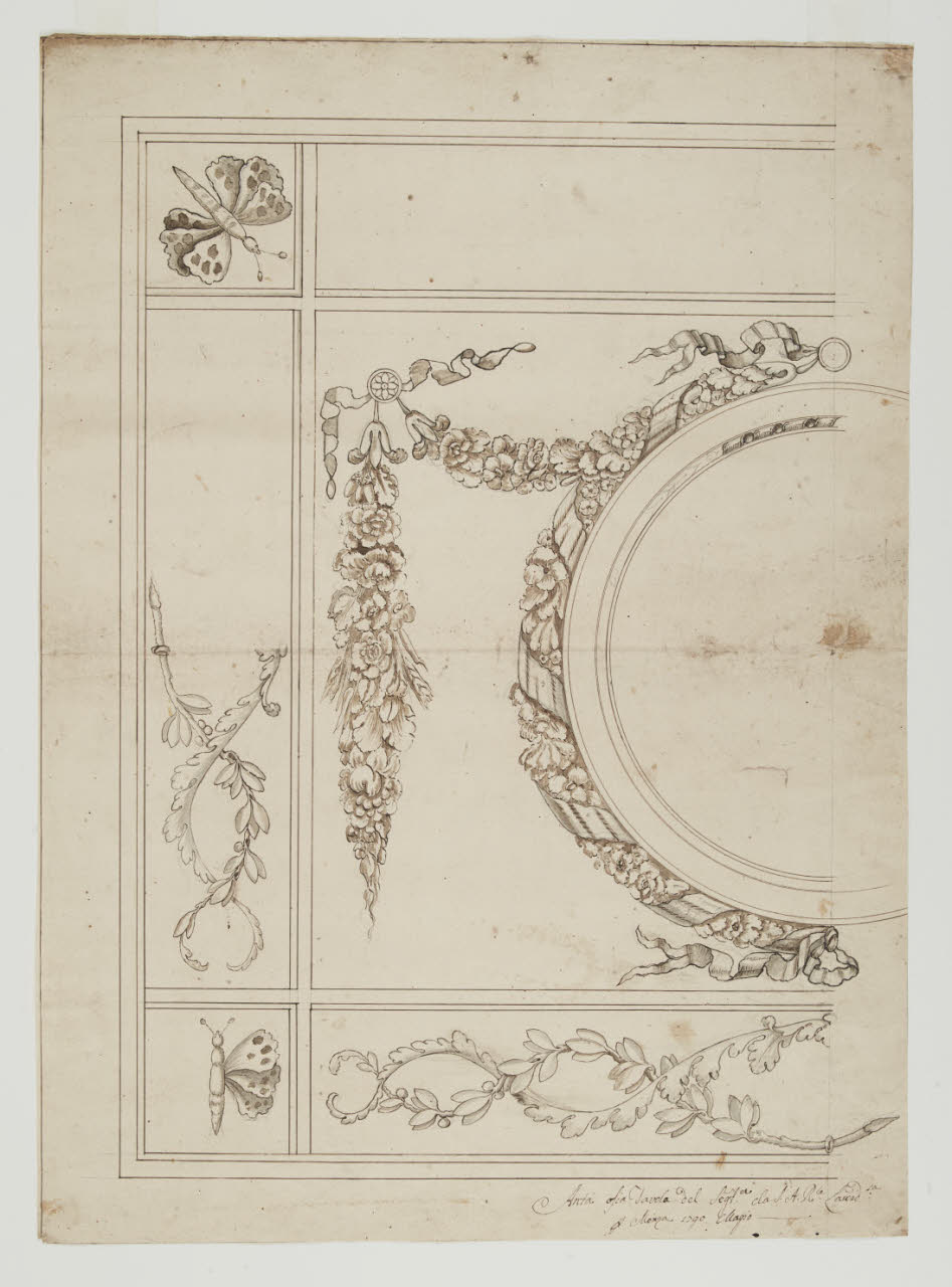 - NOTIZIE STORICO CRITICHE Il programma decorativo espresso in questo disegno si ritrova, quasi alla lettera, sul corpo superiore di un secrètaire oggi nella Palazzina di Stupinigi ma proveniente da Sala e dal Ducato di Parma (Gonzalez-Palacios 1986, I, p. 272; II, fig. 608).\nLa scritta sul presente disegno non sembra indicare questa provenienza poichè si scrive che il secrètaire era in lavorazione per S.A.R. l'Archiduchessa per Monza nel maggio 1790. Dunque si parla di Maria Beatrice d'Este, consorte del Governatore della Lombardia l'Arciduca Ferdinando d'Asburgo-Lorena. Difficile quindi conciliare quanto qui affermato con la provenienza parmense del secrètaire a Stupinigi. Ma se leggiamo quanto scritto nel disegno B 110 bis, dove si menziona un secrètaire per S.A.R., aggiungendo però "secondo", si può arguire che si parli di due mobili simili, ciò che giustificherebbe la provenienza da Parma del mobile oggi a Stupinigi. A nostro avviso, è possibile che nel 1790 siano stati eseguiti da Maggiolini due mobili simili: uno per l'Arciduchessa Maria Beatrice d'Este, un altro per l'Arciduchessa Maria Amalia d'Asburgo-Lorena, sorella dell'Arciduca Ferdinando nonchè Duchessa di Parma. D'altronde si vedrà che i disegni qui identificati come facenti parte dello stesso gruppo riguardano soltanto il partito ornamentale dell'anta e della fiancata e non includono i motivi tratti dall'antico che si vedono nel secrètaire oggi a Stupinigi. Il mobile per Monza (se esiste ancora) non è stato identificato. Per tutto questo problema si vedano anche i disegni: A 177, B 110 bis, B 604, C 97 e C 349.\n[Beretti - Gonzalez Palacios 2014]