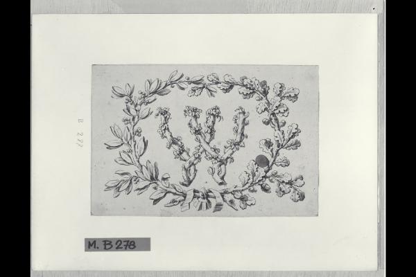 Lettera W formata da rami di vite e incorniciata da una corona di foglie di alloro e di quercia legate da un nastro