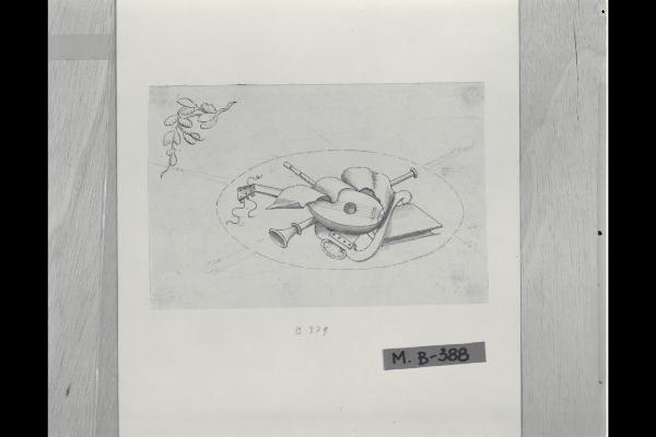 Strumenti musicali in una riserva ovale, ramoscello