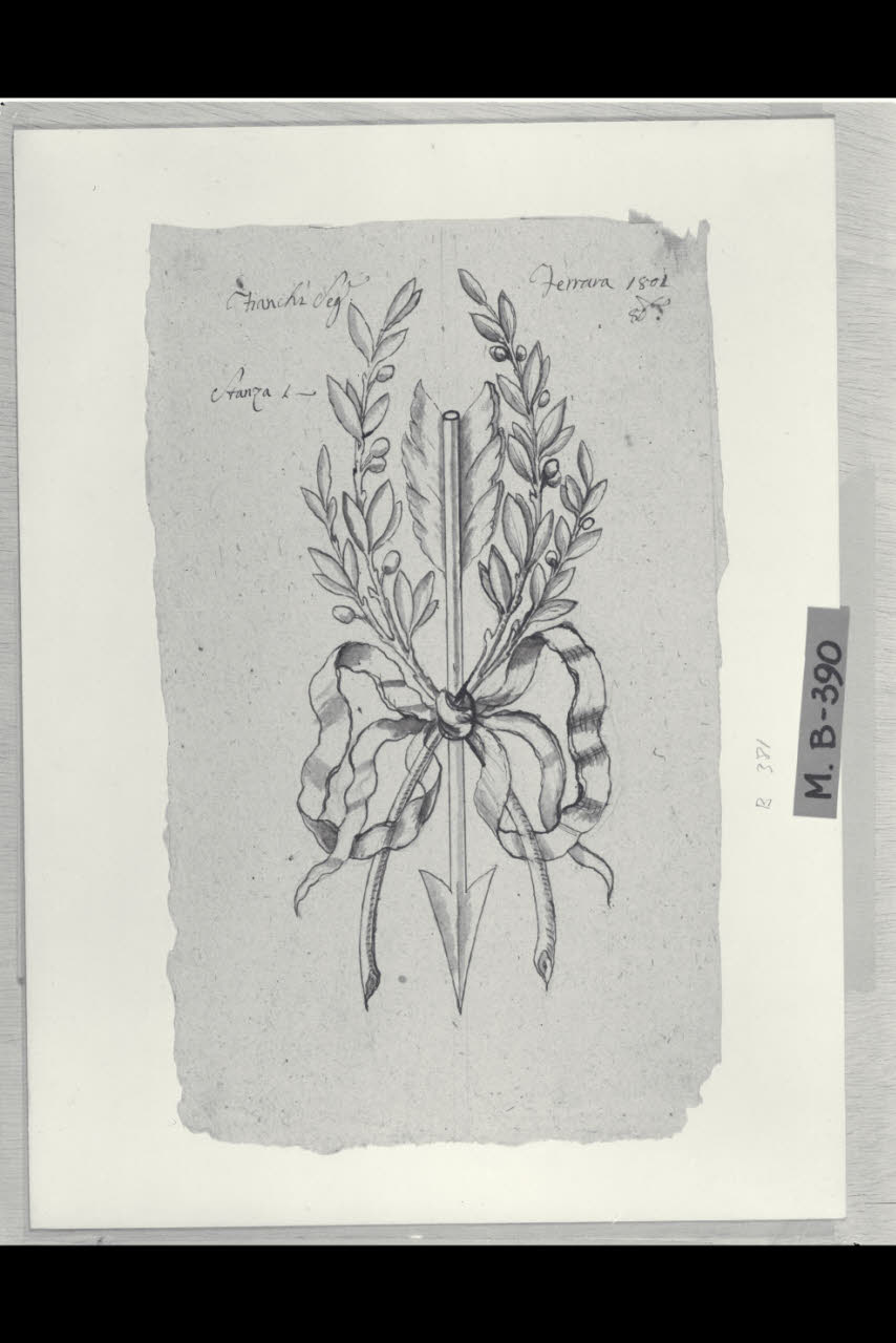 Una freccia e due ramoscelli di ulivo e di lauro legati da una galla