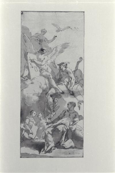 - NOTIZIE STORICO CRITICHE Il disegno in esame venne attribuito da Arslan (1954) a Giambattista Crosato e l'attribuzione fu ripresa, seppur dubitativamente, da Precerutti Garberi (1969). Di altro avviso sono Bossaglia (1973) e Martini (1989) che più recentemente hanno assegnato il foglio a Mattia Bortoloni, per le precise somiglianze grafiche che esso dimostra con il disegno preparatorio per l'Assunta in Gloria di Ospedaletto Lodigiano, realizzato entro il 1714 e oggi conservato presso la Biblioteca Ambrosiana.