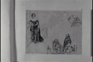 Figura femminile in abito lungo e scena goliardica con frati