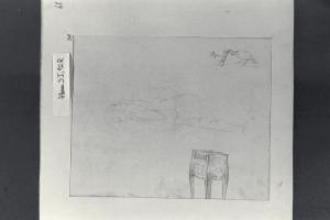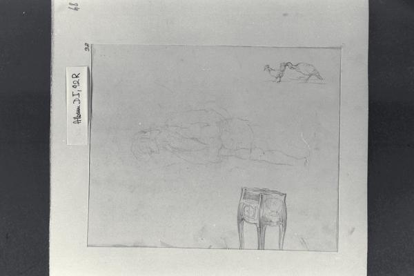 Abbozzo di figura maschile stante, due volatili e un comodino