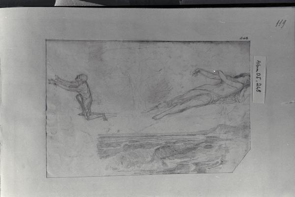 Donna sdraiata, mare e uomo inginocchiato