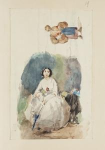 Donna seduta e figura con fardelli. Donna seduta e figura con fardelli
